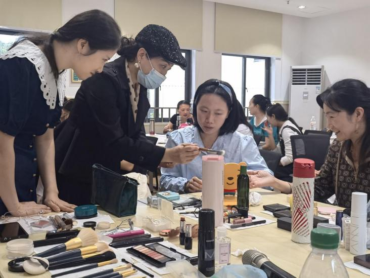 在实操环节,讲师现场邀请学员作为模特,一步步演示适合不同场合的通勤妆要点,从底妆清透到眉形设计,再到色彩搭配,细致讲解引发阵阵惊叹。此外,职场穿搭技巧分享同样气氛火热,讲师们从服装的颜色、面料、风格方面讲解,为大家的职场服装搭配提供了多种思路。